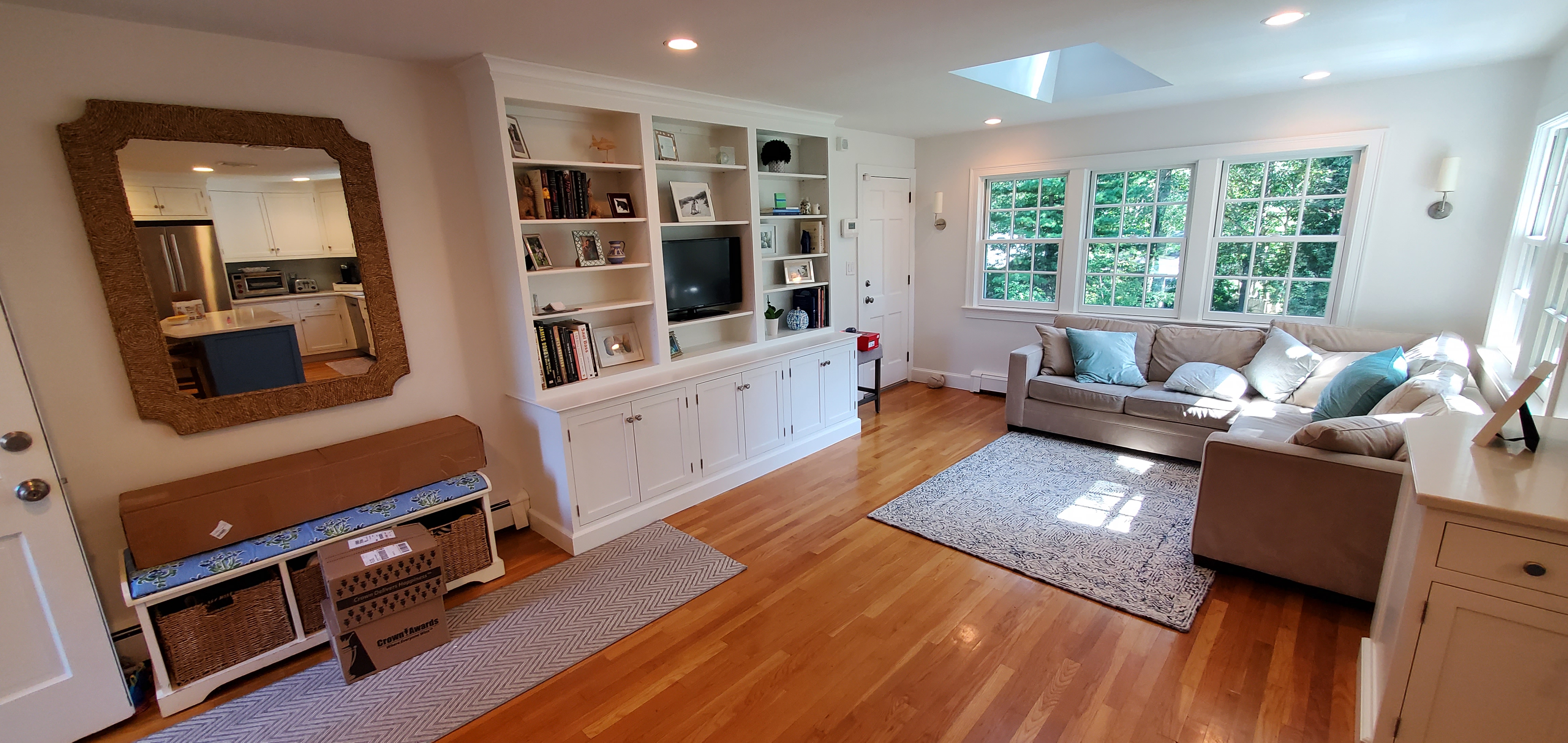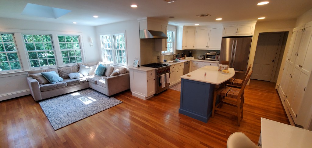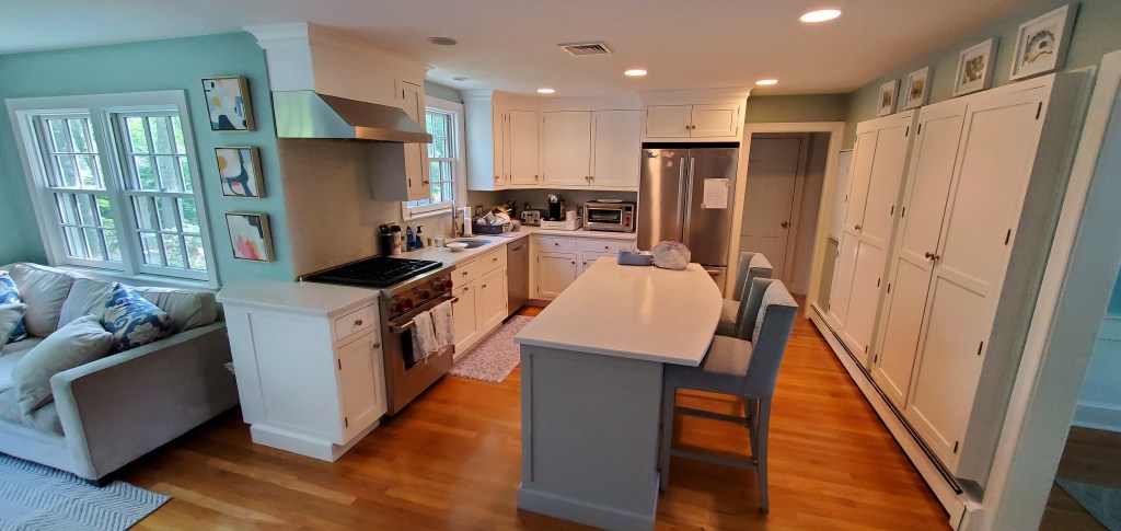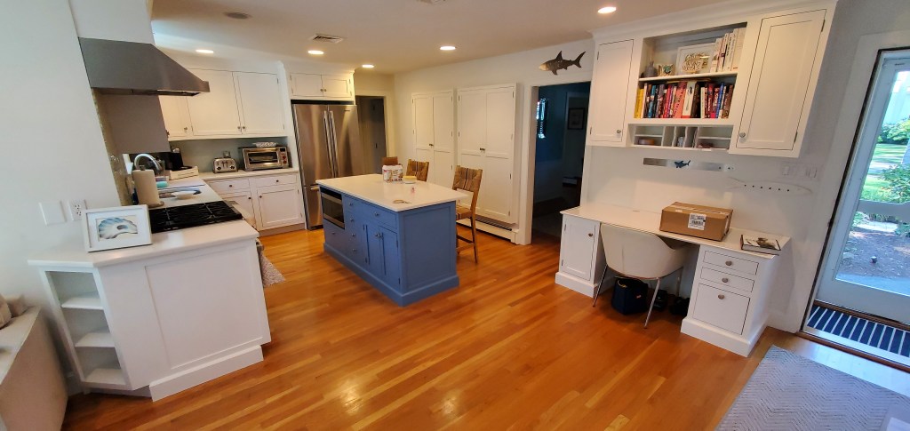 Initially, the owner hired us to paint the exterior of his beautiful house. Just before we began, he asked us to work on his kitchen as well. The cabinets had been painted previously but were in need of a fresh coat. They decided to change the color of the island only, while keeping the rest of the cabinets white. After the cabinets were finished, they decided to have the entire kitchen painted, including the walls, windows, doors, and trim. We were very happy to complete this entire project.
